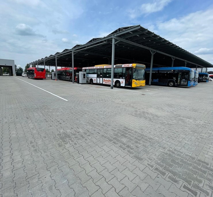 Une réalisation originale de carport pour bus avec zones de recharge, d'une hauteur de 6m !