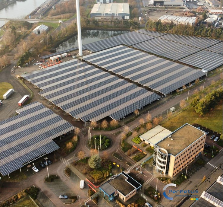 Pour ce chantier de 12,7 MWp en Belgique, nous avons fourni d'une part un carport bipieu et d'autre part, une structure est-ouest avec vis de fondation.